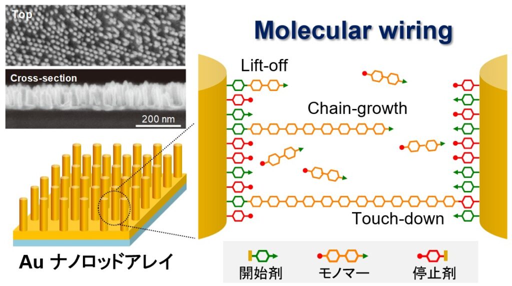 金ナノロッドから成長した高分子鎖が、約17 nm先にある別のナノロッドへ到達し、その表面で反応停止するという一連のプロセスが明確に示され、ワイヤー成効率(wiring efficiency)は 8〜13% と評価されました。これは、分子配線技術の実現可能性を示す重要な成果です。